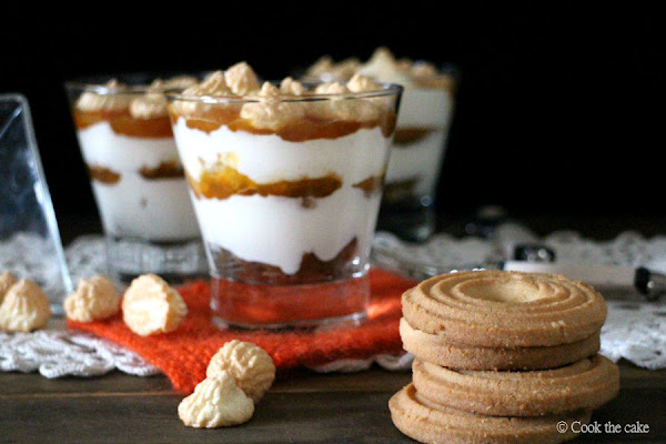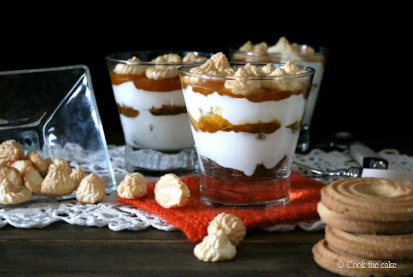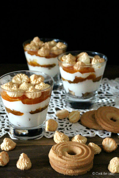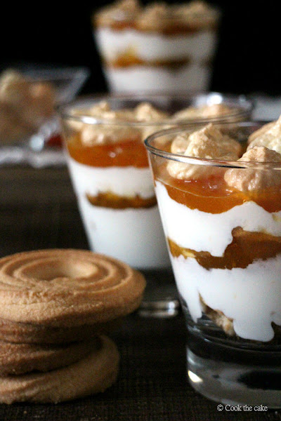 Esta versión, presentada en una copa de vidrio, yo diría que se parece a un trifle formado por capas de galletas de mantequilla, requesón y mermelada de albaricoque, y coronado con merengue. Decidme si tengo o no tengo razón.