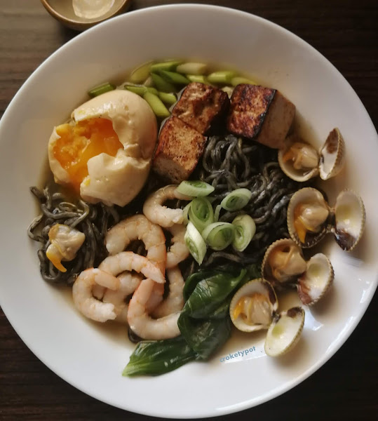 Ponemos caldo en el fondo del plato, luego los fideos, añadimos el tofu, las gambas, el pak choy los berberechos, añadimos la cebolleta en el centro y el ajete a un lado. Por último ponemos el huevo y añadimos un par de cucharadas de la base de sal y a disfrutar.