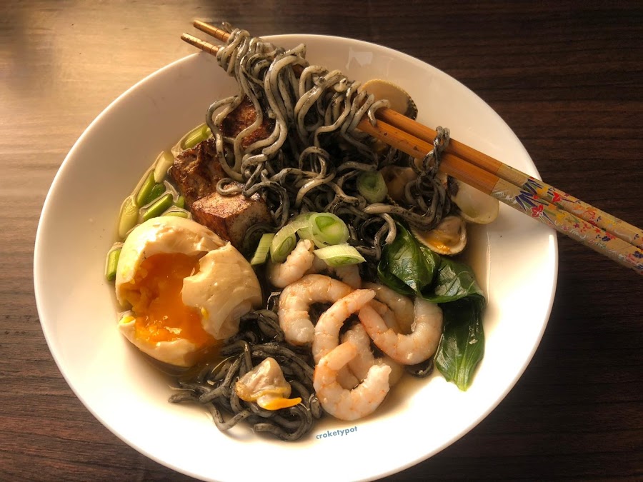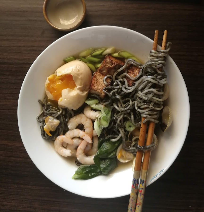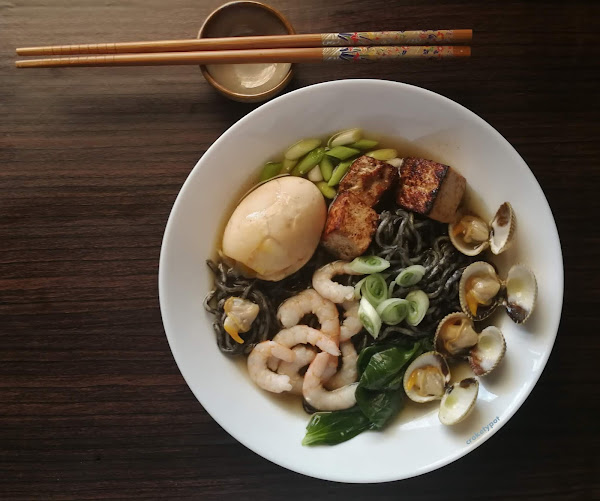 Hoy he preparado un ramen con un caldo a base de pescado, y acompañado con tofu para que resulte nutritivo, sabroso y ligero, lleva el huevo característico, y como toppings gambas, berberechos, pak choy, tallo de cebolleta fresca y ajetes, entre otros.