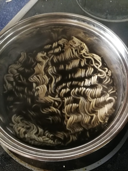 Los fideos se cuecen en caldo de pescado con un sobre de tinta de calamar, es mejor que no tenga mucha agua para que concentre la tinta y los fideos se pongan además de negros, que tomen más color.