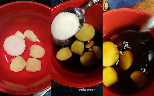 En un cazo , ponemos la cebolla partida, el ajo chafado, y demás de los ingredientes de los ingredientes de la base de sal jengibre , 1 vaso de agua, 1/2 vaso de salsa de soja, 1/4 vaso de mirim, 1 cucharada de sake, calentamos a fuego lento y reservamos.