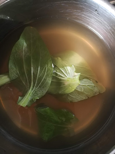 Tendremos preparadas las gambas cocidas y abrimos los berberechos a la plancha. El pak choi o la verdura que le pongamos la cocemos 5 minutos en el caldo del pescado.
