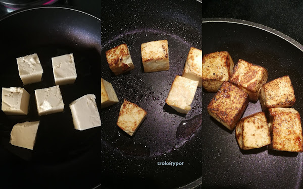 Cortamos el tofu a cuadros y se pasa por la plancha hasta dorarlo con un poco de aceite de sésamo y una cucharada de salsa anterior y cuando lo veamos dorado lo añadimos al bol de la base de sal, una hora.