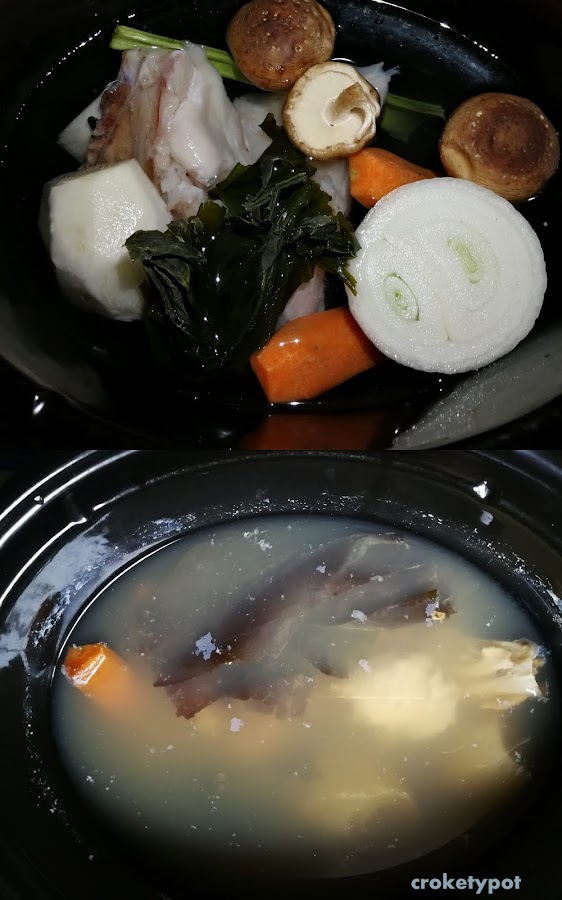 En la olla lenta ponemos los ingredientes del caldo con agua y ponemos a cocinar en alta 8 horas. Colamos el caldo y reservamos.