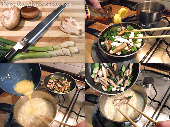2. Limpia y corta las shiitakes en láminas de medio centímetro o menos. Límpia las cebolletas y deshecha sus raíces. Corta las cebolletas al biés en rodajas de medio centímetro.
