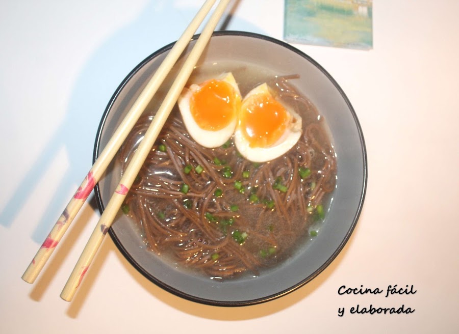 Ponemos el caldo al fuego, una vez que hierva, añadimos los fideos soba y dejamos cocer 3 minutos.