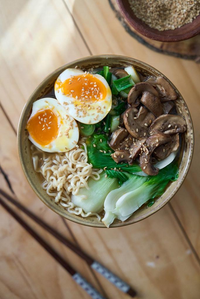 Servir en un plato hondo una porción de noodles, cubrir con el caldo y agregar las verduras, los champiñones, las callampas secas picadas y el cebollín salteado, y finalmente el huevo partido a la mitad. Decorar con sésamo y listo para disfrutar!