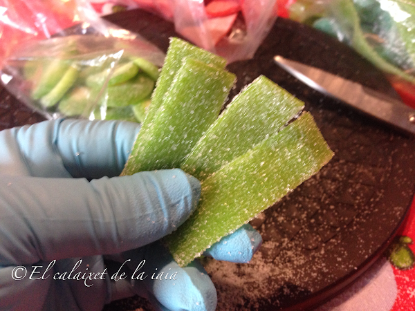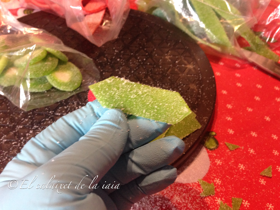 si no encontrais kiwis de chuche, podeis utilizar cintas verdes, para simular las hojas de la rosa, para ello, cortaremos cada cinta en cuatro partes