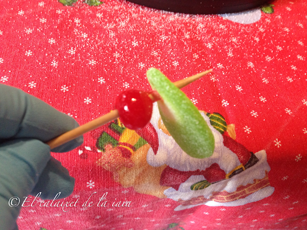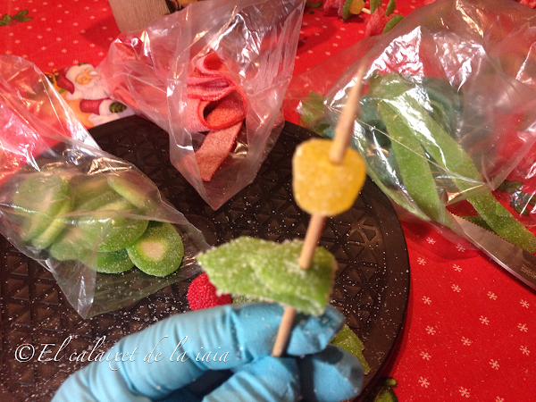 y con el palo con la gominola y la hoja de kiwi o cinta