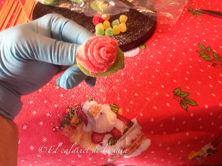 Pincharemos en un palo de brocheta, una bolita una gominola redonda, ésto hará que quede sujeta nuestra rosa y no se deslice hacia abajo del palito
