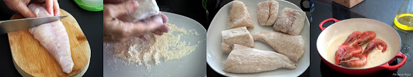 Cortar cada lomo en tres o cuatro trozos y salpimentar. Poner un poco de harina en un plato y enharinar el pescado, sacudiéndolo un poco para que suelte el exceso de harina. Reservar.