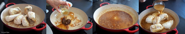Volver a colocar el rape en la cazuela e incorporar el caldo de pescado.