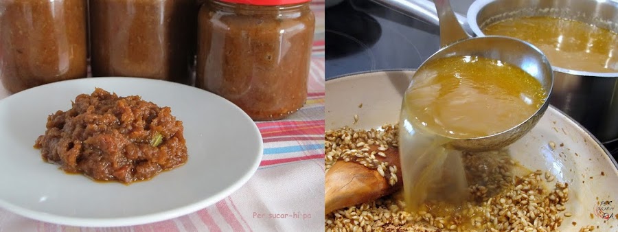 Mientras elaborar la picada. Pelar y picar el ajo y el perejil, colocar con el resto de ingredientes en el mortero e ir machacando poco a poco. Cuando se hayan integrado los ingredientes y tengamos una pasta seca añadir un poco de caldo para ligarla mejor.