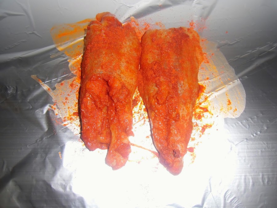 Echamos dos o tres cucharadas de pimentón sobre un trozo de papel de aluminio y pasamos las colas de rape por encima hasta que queden bien impregnadas por ambos lados.
