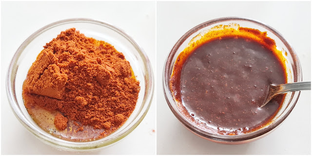 3. - En un bol ponemos un poco de sal, pimienta y pimentón y un par de cucharadas de aceite y lo mezclamos bien.