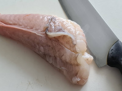 1. - Comenzaremos limpiando el rape, cortando las dos partes de la cola y quitándole la piel y la espina.