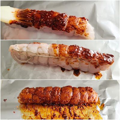4. - Ponemos un trozo de papel de aluminio y colocamos el rape ya atado y lo pincelamos con la mezcla de pimentón por todos lados.