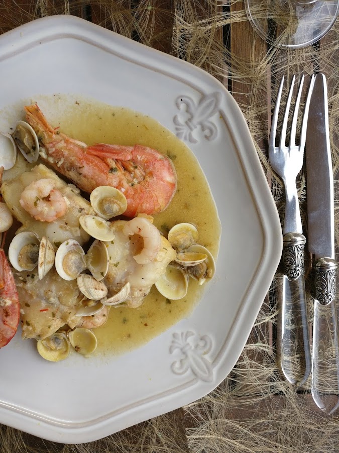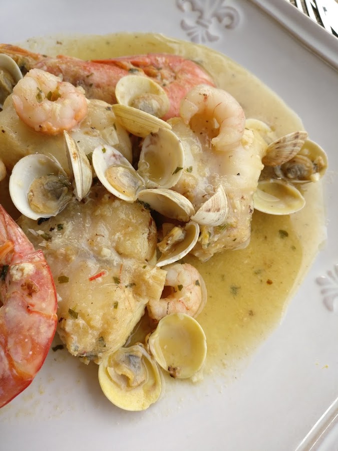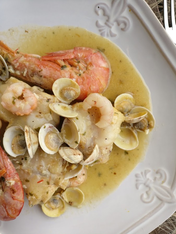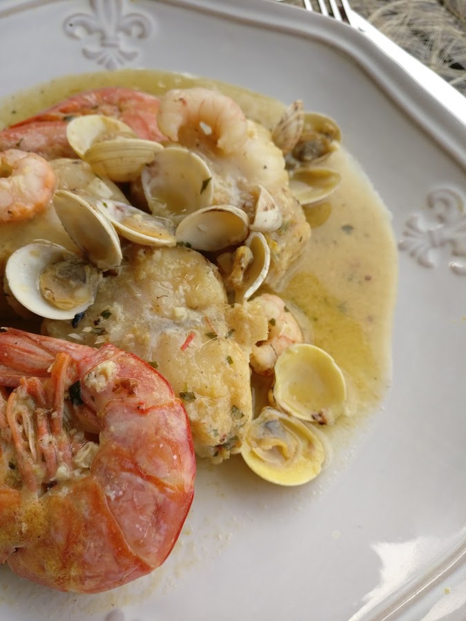 Volvemos a meter las colas de rape y movemos la cazuela con movimientos en redondo para que se mezclen todos los ingredientes. Bajamos el fuego y dejamos que se cocine a fuego lento unos 5 minutos, removemos con cuidado y pon las gambas pelada, las almejas que habremos abierto a parte con un poco de vino y las gambas que tiníamos apartadas.