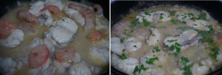 Cuando ya esté el pescado añadimos los langostinos un par de minutos. Picamos bastante perejil lo añadimos a la cazuela y apagamos.