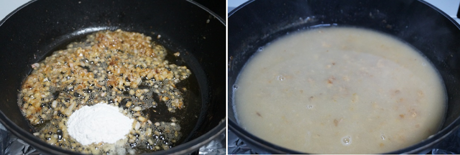 En esta misma cazuela con el aceite que tenemos con el jugo de los langostinos, añadiremos un poco más de aceite si hace falta, añadiremos la cebolla picada y los ajos. lo dejamos cocinar a fuego medio para que quede bien pochada la cebolla.