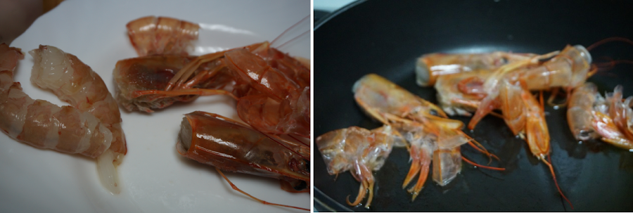 Pelamos los langostinos, quitamos las cabezas y la cáscara del cuerpo. Ponemos una cazuela con un buen chorro de aceite, añadimos las cabezas y cáscaras de los langostinos. Dejamos que suelten todo el sabor en el aceite. Las sacamos y las podemos añadir al caldo del pescado.