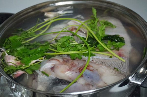 Lo primero será poner la cabeza y espinas del rape y otros pescados a hervir para preparar el caldo de pescado. Lo pondremos con un poco de perejil, unos dientes de ajos enteros y un puñado de sal. Lo dejaremos cocinar 20 minutos. Reservamos.