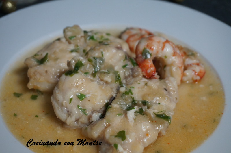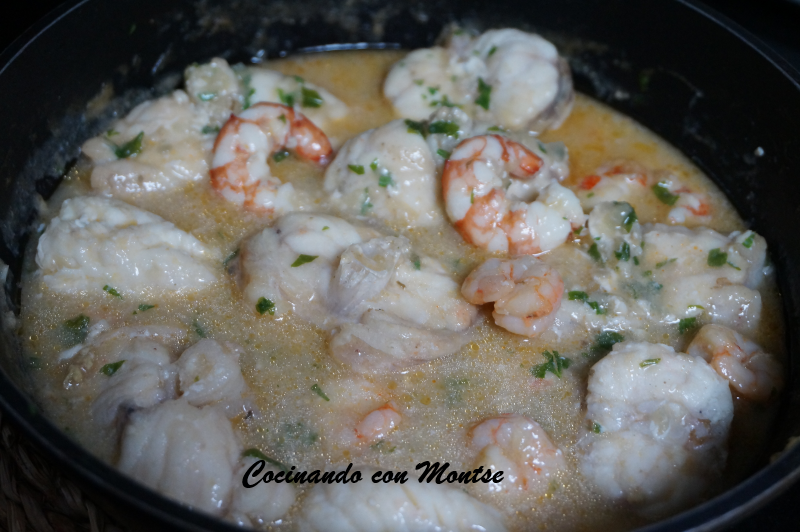 Rape con langostinos en salsa, un pescado blanco muy nutritivo y saludable. Un plato sencillo, rápido de preparar y muy bueno.