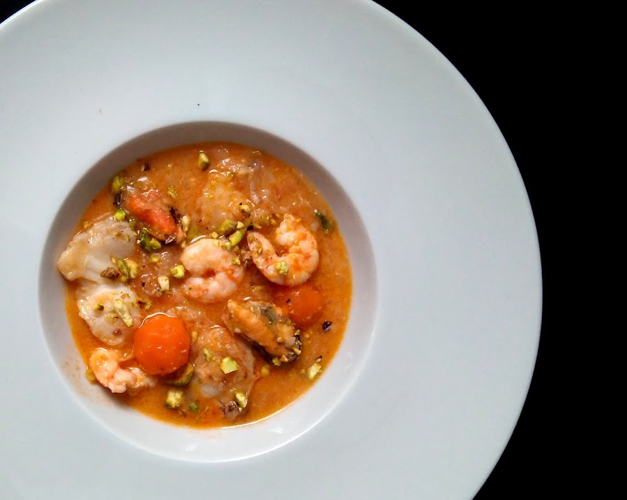 -Después de hervir el caldo durante unos 20 minutos retiramos los huesos de rape. Y entonces añadimos el rape salteado, los langostinos, las almejas y los mejillones. Damos un hervor y servimos.