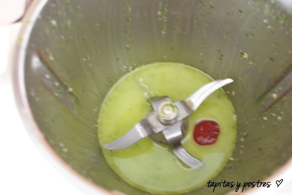 Si no tenemos thermomix podemos triturar el ajo, la sal y las hojas de albahaca en un mortero. Agregamos el aceite y los piñones picaditos , removemos y por último el tabasco o salsa chili.