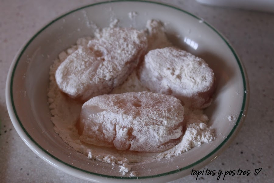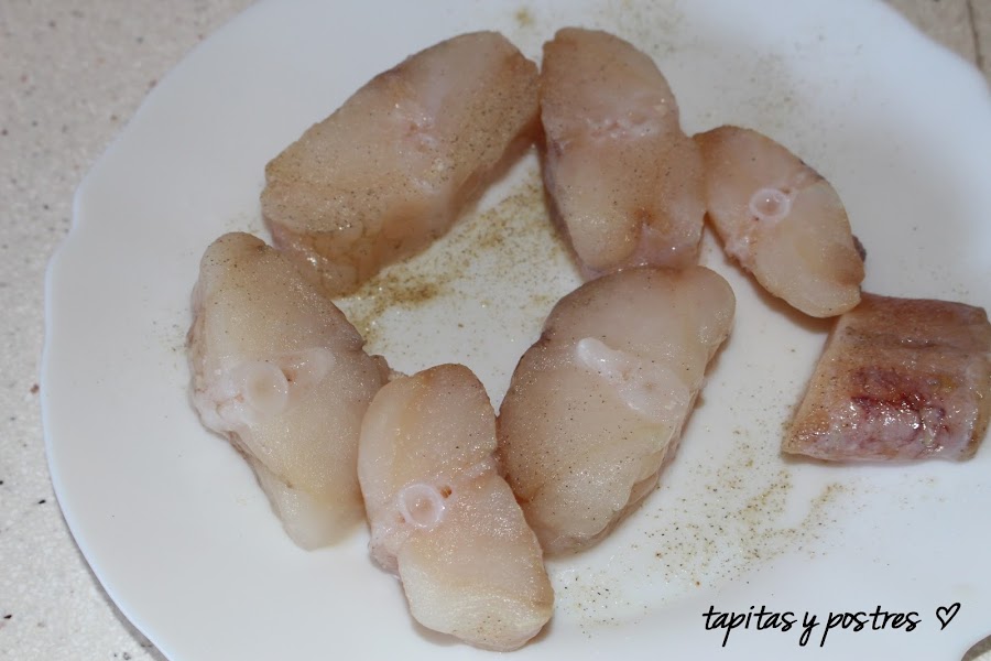 Salpimentamos las rodajas de rape y las pasamos por harina. Quitamos el exceso de harina y freímos en una sartén con abundante aceite caliente hasta que estén doradas. Dejamos sobre un papel absorbente para que escurra el aceite sobrante.