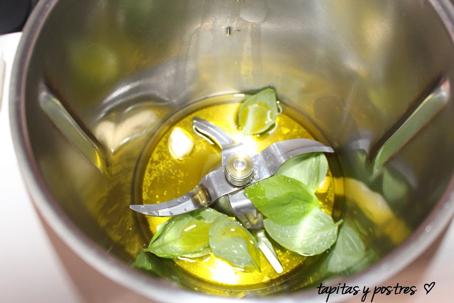 Comenzamos con el mojo de albahaca. En el vaso de la thermomix ponemos el aceite, el ajo, un poquito de sal y las hojas de albahaca. Trituramos 20 segundos a velocidad 8. Comprobamos que hemos triturado bien las hojas.