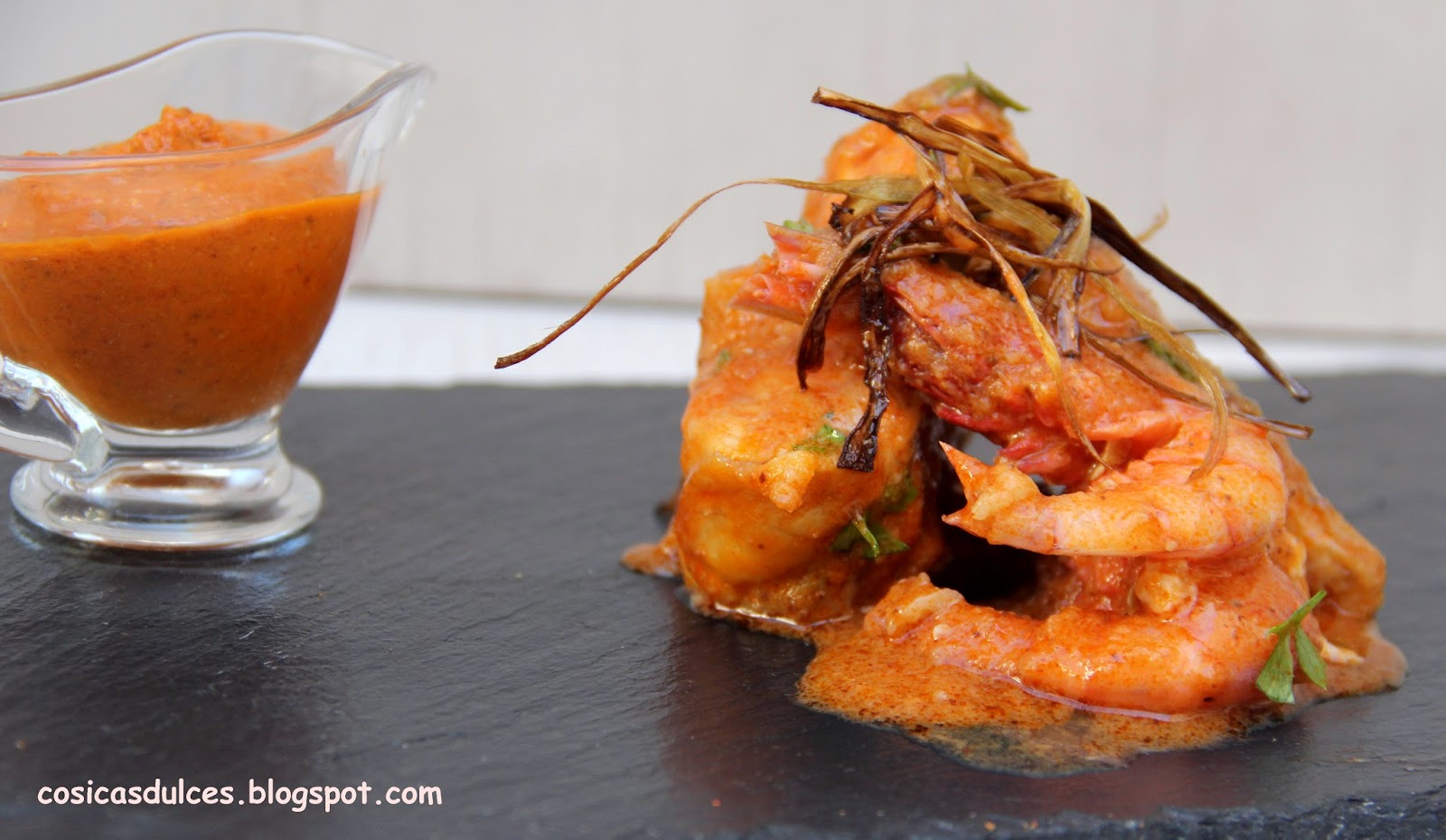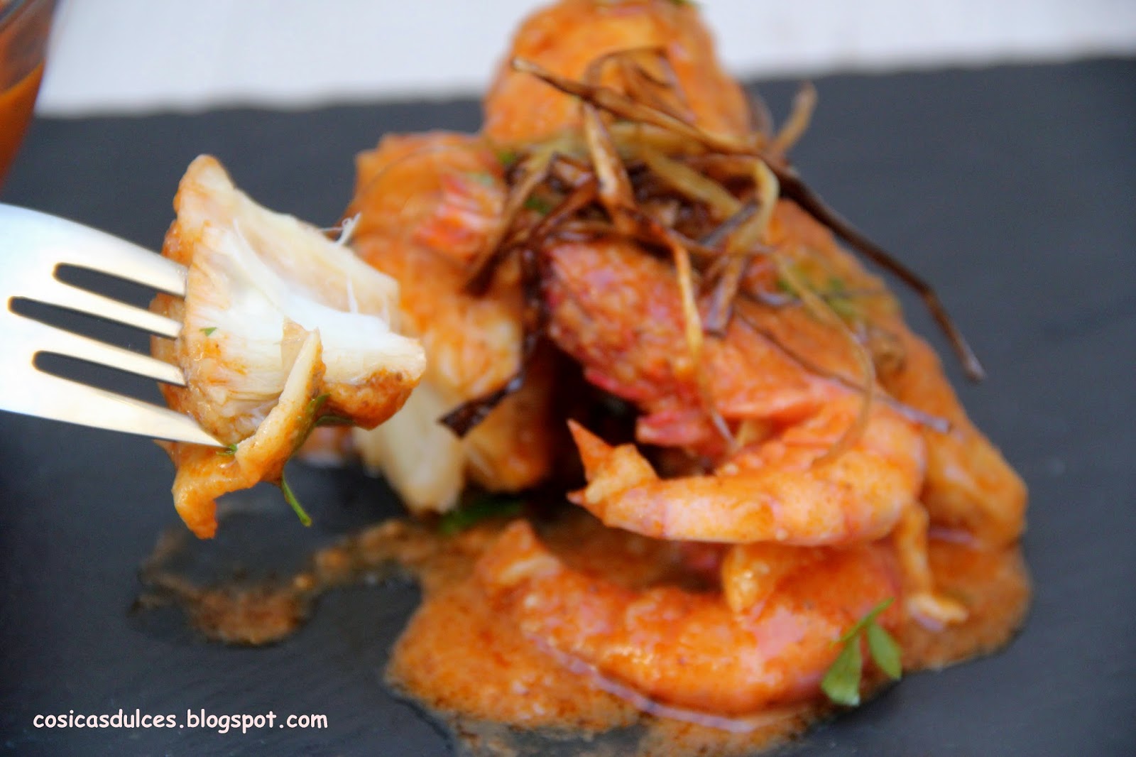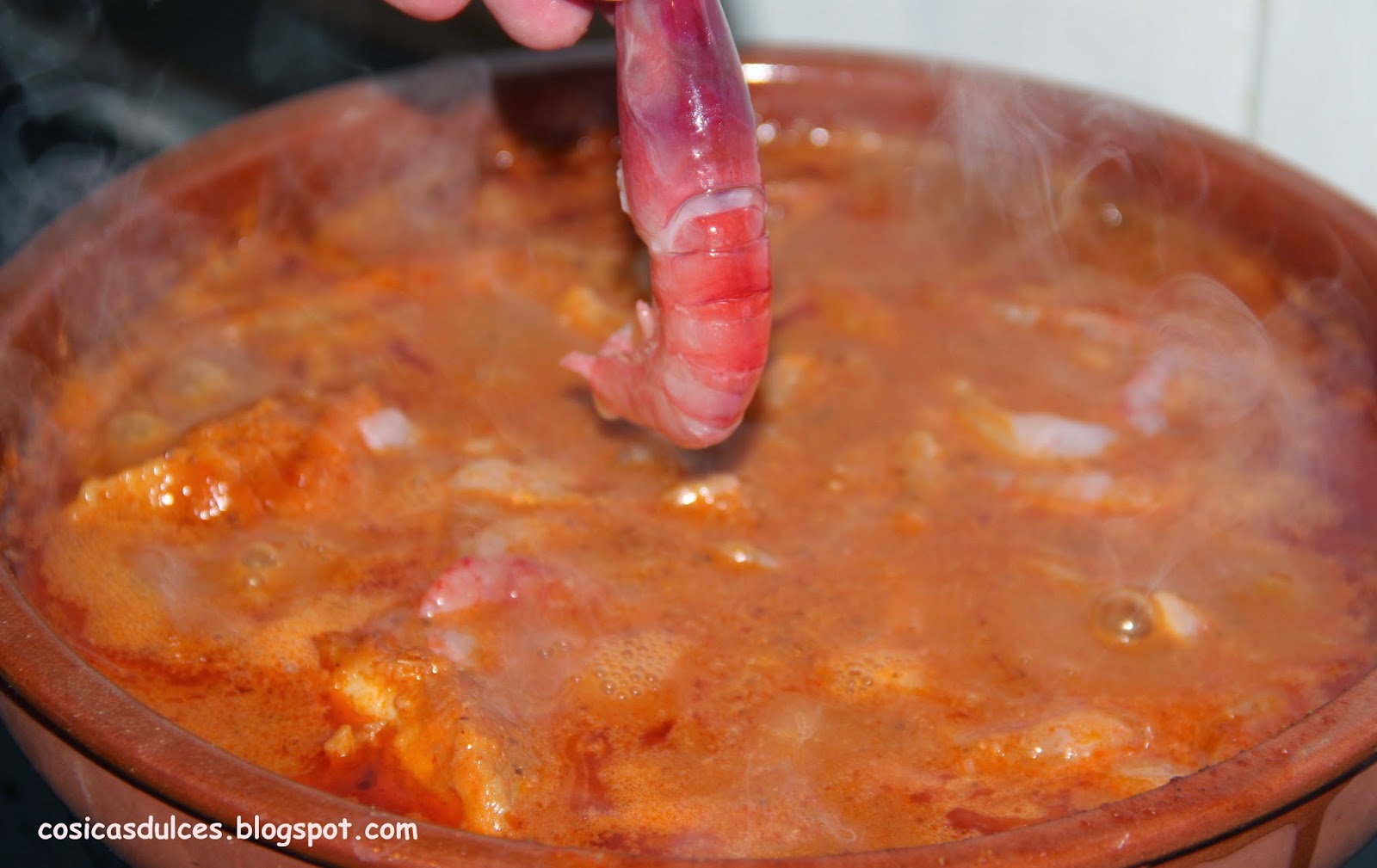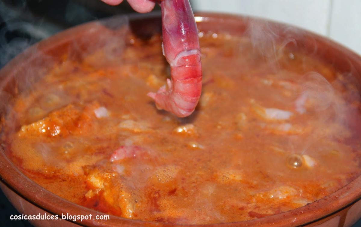 Dejamos cocinar hasta que la salsa espese. Cuando apenas falten unos minutos para retirar añadimos las gambas. A mi me gusta ponerle una buena cantidad de gamba pequeña pelada (pero siempre fresca) y unas cuentas gambas rojas sin pelar.
