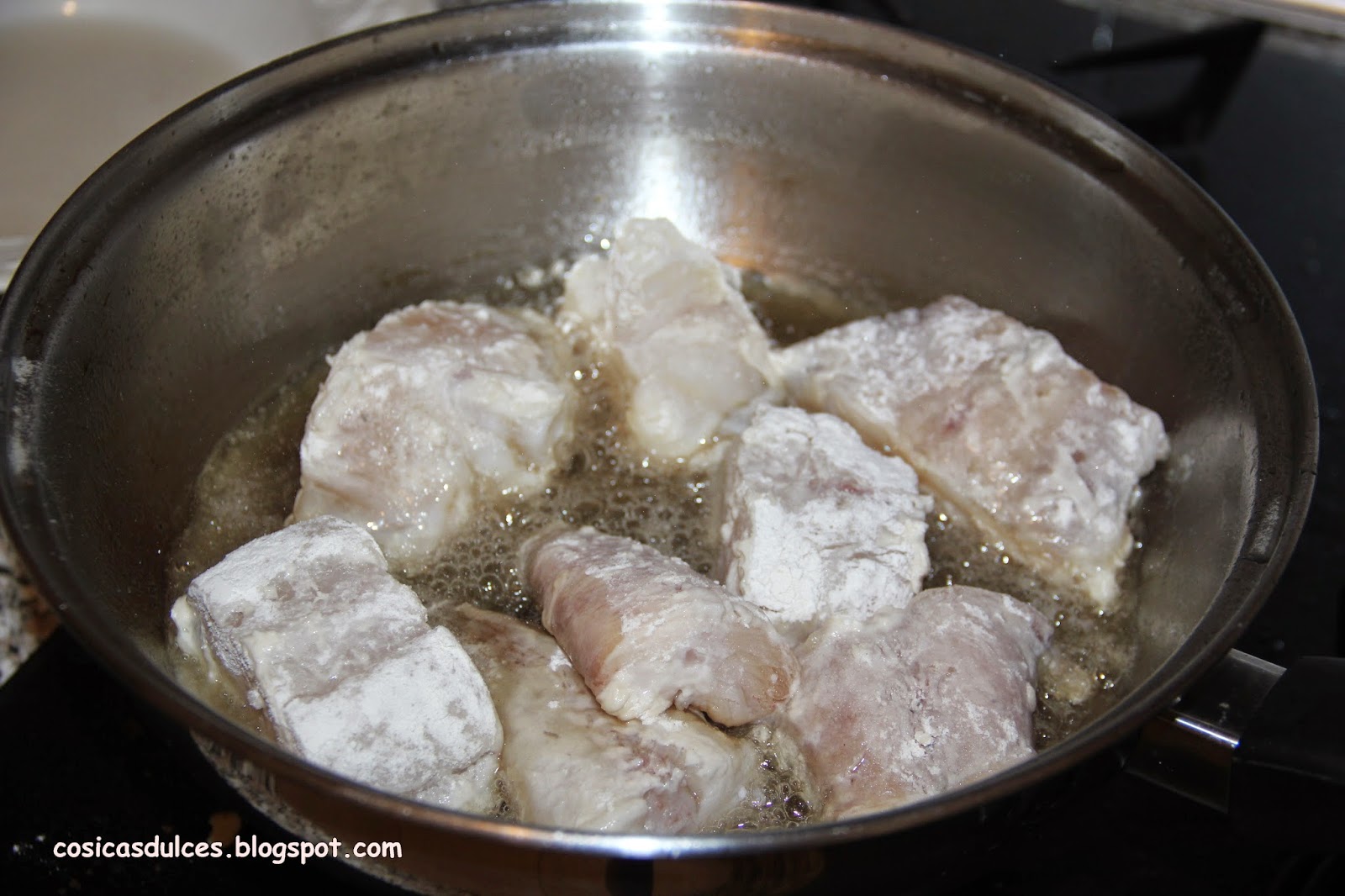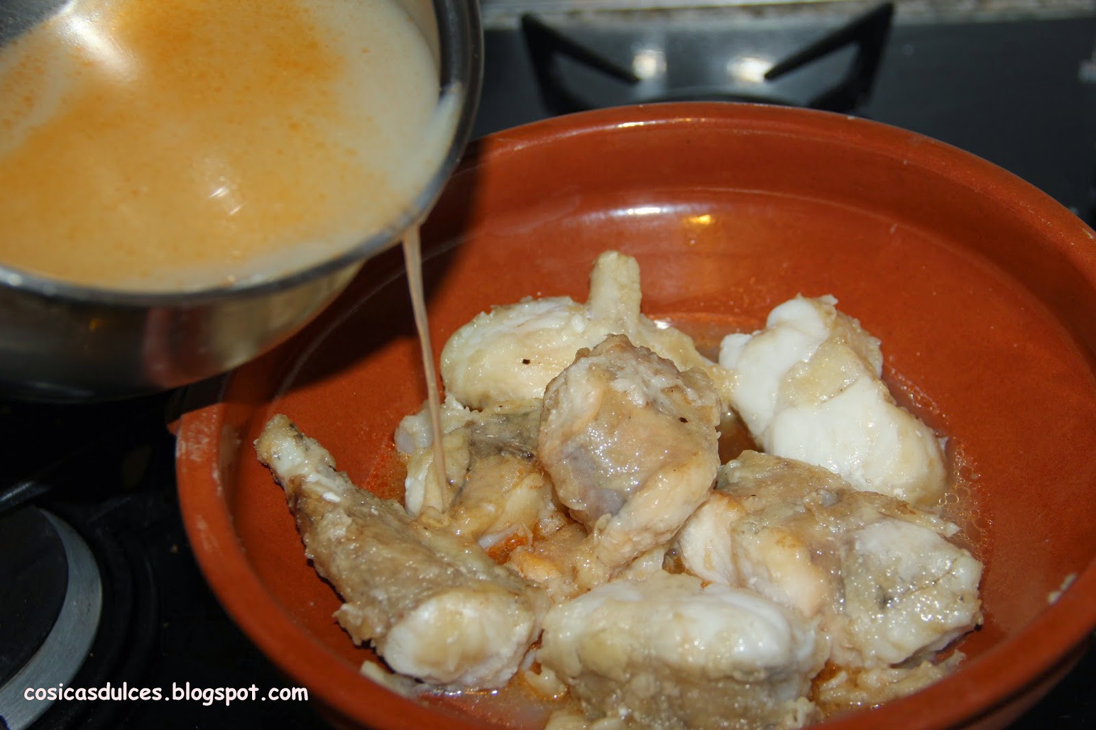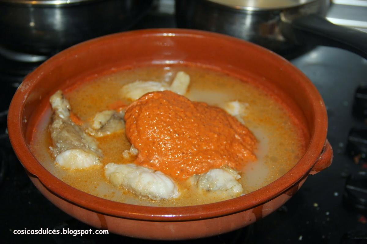 Pasamos los trozos de rape ya fritos a una cazuela de barro y los cubrimos con el fumet que teníamos reservado.