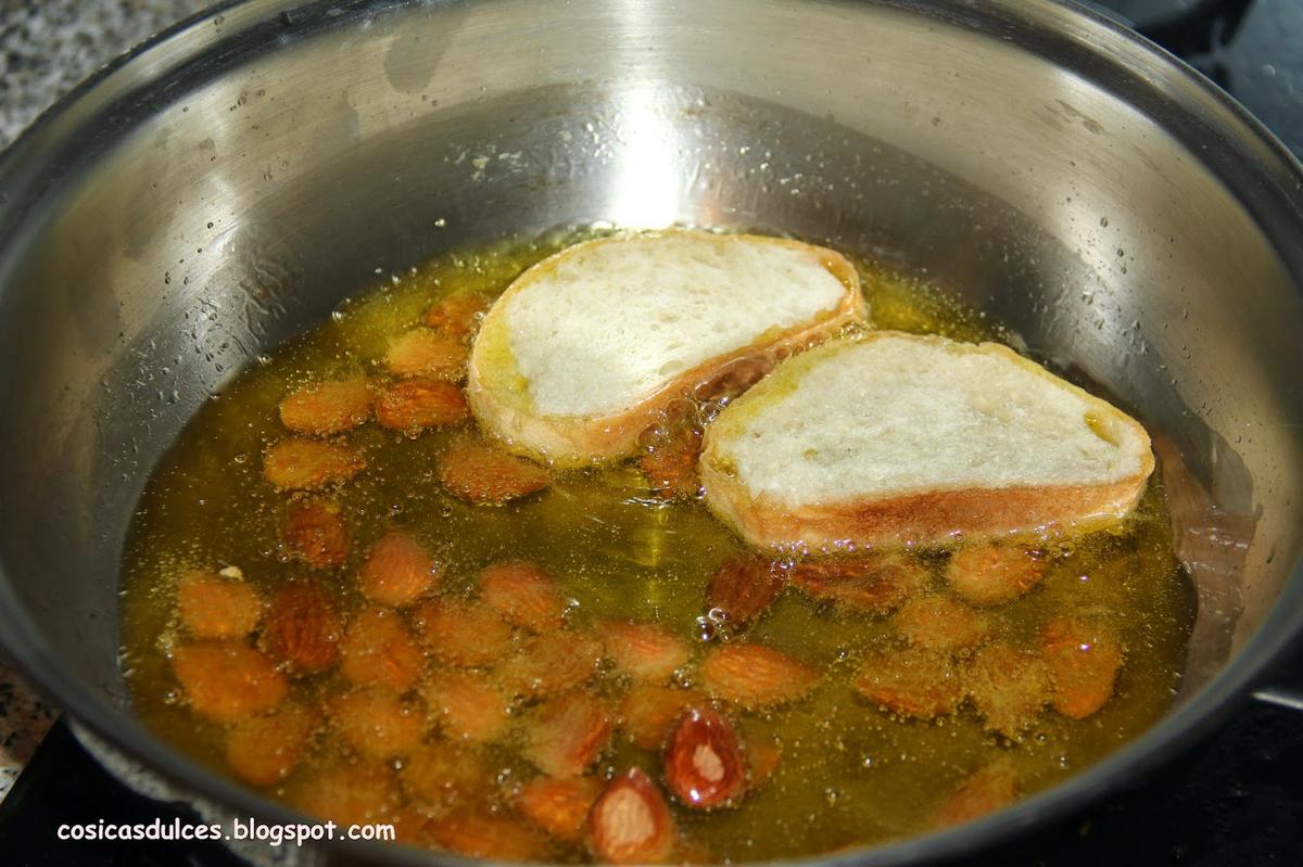 Comenzamos a preparar la salsa. En una sartén doramos las almendras (con cuidado de que no se quemen) y las rebanadas de pan. Cuando estén listas las pasamos a un mortero y hacemos una picada.