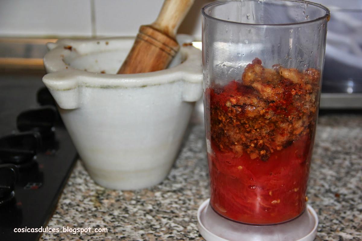 En un bol colocamos los tomates y los dientes de ajo (yo puse 4) que previamente habremos asado. Añadimos la picada, la carne de pimiento choricero, el aceite, el vinagre, la sal y el pimientos y trituramos bien. Reservamos la salsa.