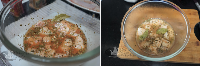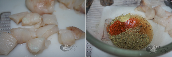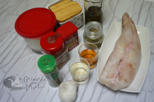 Empezaremos a preparar el rape en adobo. Lo primero lo limpiamos, quitamos espinas, quitamos las telillas que tiene y lo cortamos en trozos. Esto os lo pueden hacer en la pescadería.En otro bol pondremos todas las especias, picamos el ajo y añadimos las hojas de laurel. Añadimos el vinagre y el rape, terminaremos de cubrir con agua. Metemos el bol con el rape en la nevera bien tapado y lo dejamos entre 6-8 horas o de un día para otro.