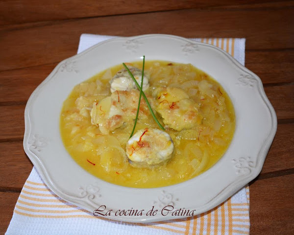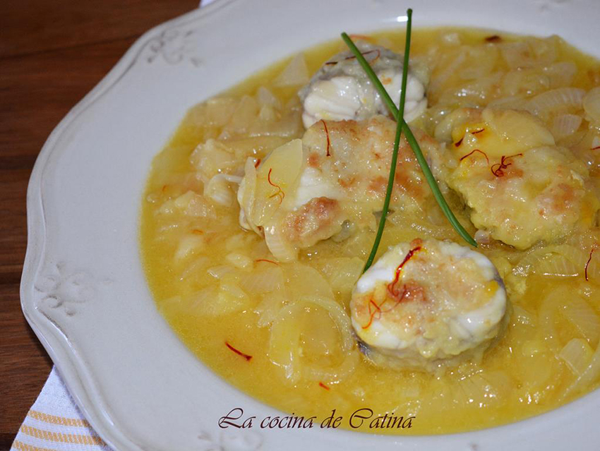 En un mortero, majamos las hebras de azafrán con una cucharada del caldo de cocción, lo añadimos a la sartén, removemos todo bien e incorporamos las rodajas de pescado fritas.
