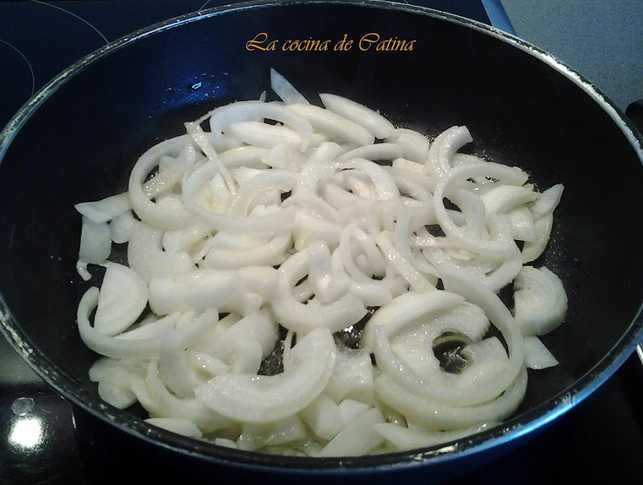 Pelamos y picamos la cebolla. Calentamos un par de cucharadas de aceite de oliva en una sartén y pochamos la cebolla a fuego lento con una pizca de sal.