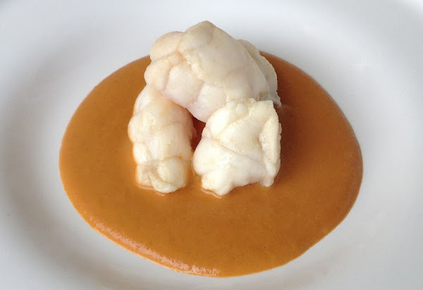 Ya tenemos lista la salsa americana. Ahora vamos con el rape: es muy sencillo, cortamos la cola en tacos, salamos y los pasamos por una sartén caliente con unas gotas de aceite de oliva. Hay que pasarlo muy poquito, no hay que tener miedo de que nos quede crudo. El rape se terminará de hacer con el calor de la salsa. En cuanto esté de color blanquito, retiramos y reservamos.