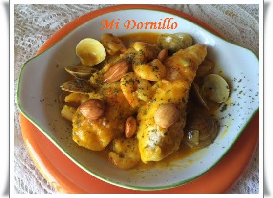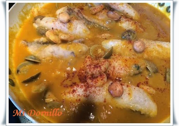 Aparte en una sarten ancha ponemos un poco de aceite de oliva sofreimos la cebolla muy picada, y cuando dore, le ponemos la harina. Ponemos el pimentón y el azafrán que se refría un poco y añadimos el vino y subimos el fuego para que evapore. Poner como 1 vasito del caldo. Cuando tome calor, ponemos las colas de rape, después las almejas, cuando abran ,las gambas y añadimos caldo si hiciese falta. Rectificamos de sal y apartamos.