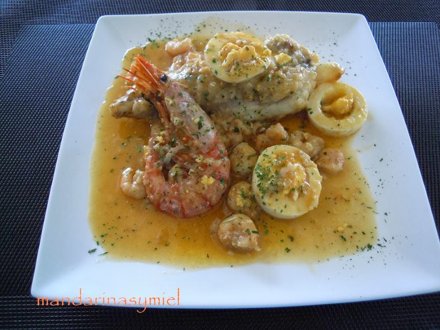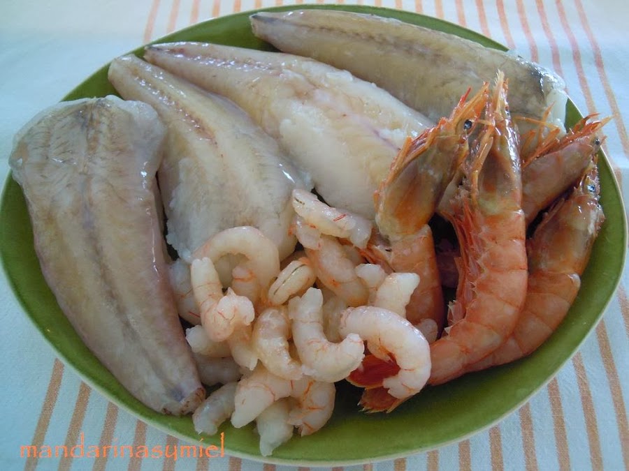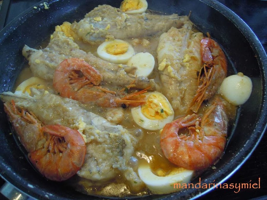 Coloca ahora otra vez las colas de rape, mueve la cazuela para que se mezclen todos los ingredientes y deja a fuego lento unos 5 minutos, remueve con cuidado y pon las gambas peladas y las gambas que tienes apartadas.