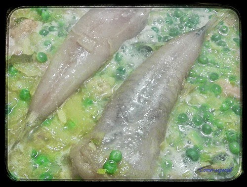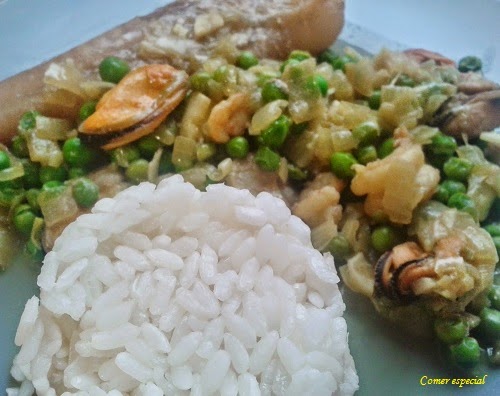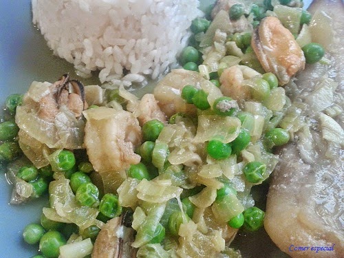 INGREDIENTES (para 2 personas): una cebolla, un diente de ajo, 80 gramos de gambas peladas y con las tripas quitadas, 80 gramos de mejillones sin barbas, una hoja de laurel, un vaso grande de vino blanco, agua, ajo molido, dos colas de rape de unos 350 gramos en total, 100 gramos de guisantes, una cucharada de aceite de oliva, sal, 80 gramos de arroz blanco.