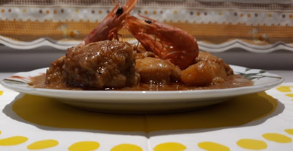 Ponemos una cazuela con el aceite sobrante y un poco más, y doramos las cebollas cortadas en trocitos, cuando esta dorada ponemos el Rape, añadimos el Brandy, y después vamos mezclando con cuidado el majado del mortero, ligando poco a poco con fumet de pescado, que habremos hecho con la espina y la cabeza del rape, dejar cocer una media hora más o menos antes de apartar añadir los gambones entero sin pelar el perejil y rectificar de Sal.