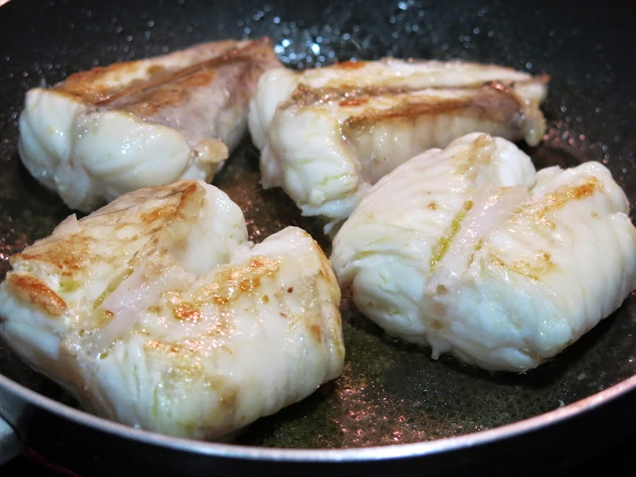 En otra sartén con un chorrito de aceite, ponemos los dientes de ajo enteros y los lomos de rape. Una vez se han hecho por los dos lados, ya podemos retirar e incorporar al plato.
