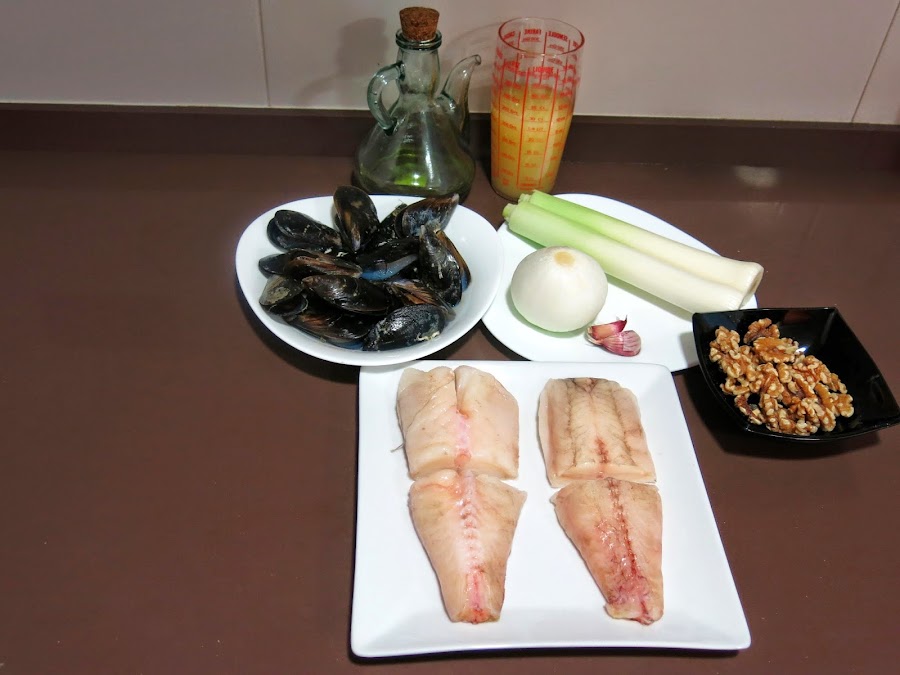 Una vez se han pochado las verduras, incorporamos la ?harina de nuez?, un chorrito del caldo de los mejillones y el caldo de pescado (pensar que debe de quedar una salsa espesa, por tanto si todo el caldo de pescado lo considerais excesivo, echar solamente un chorrito también, jugar con las cantidades, incluso podeis utilizar únicamente el caldo del mejillón).