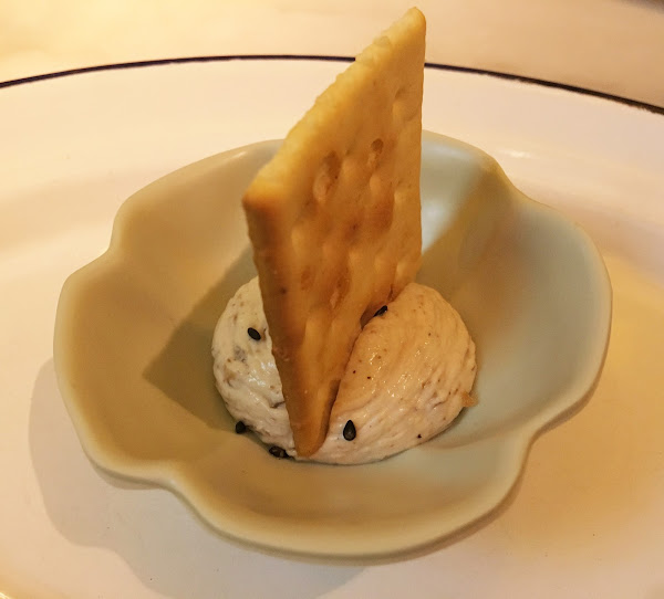 Nos recibieron con un aperitivo de crema de queso con semillas de sésamo acompañado de una tosta de pan mientras esperábamos las bebidas para ir abriendo boca.