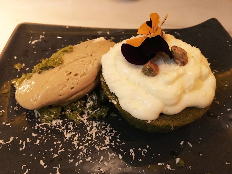 De postre pedimos para compartir un muffin de té matcha con crema de yuzu y helado de pistacho artesanal, ya que nos pareció el más original de los postres que tenían. Estaba rico, combina diferentes texturas y sabores que congenian muy bien.
