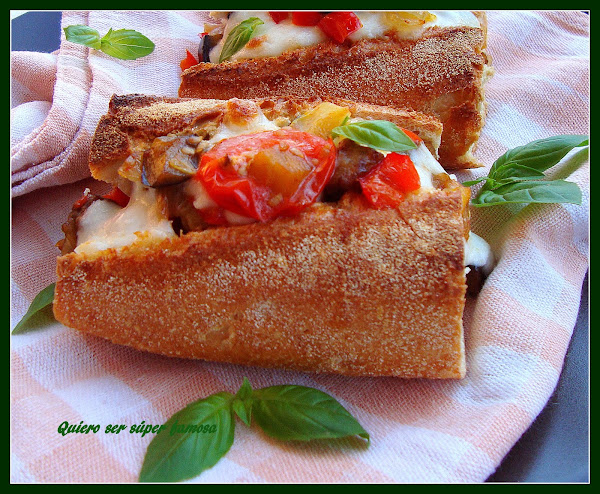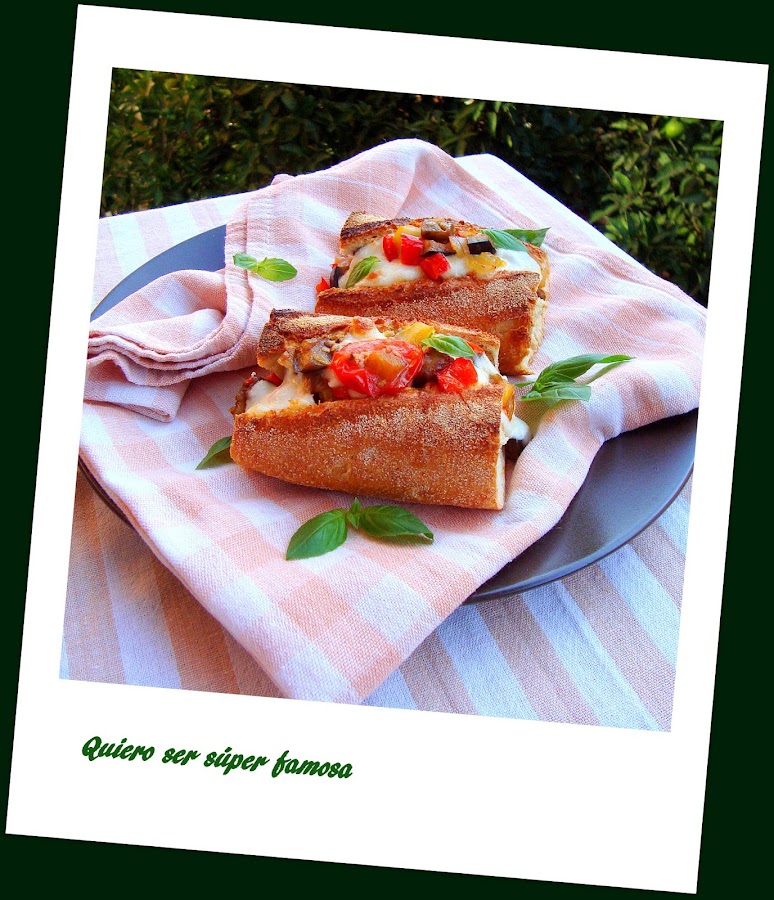 Los que me conocen saben que no soy de coger un trozo de pan con cualquier cosa dentro, por lo general me tomo mi tiempo para preparar lo que voy a poner en el plato. Muchísimas veces opto por el pan con tomate, ligeramente tostado, con el chorrito de aceite de oliva virgen y lonchitas de jamón bien finas para poder degustarlas mejor. No solo porque lo tengo como cultura sino porque me encanta de ese modo. Pero muchas otras veces opto por los bocadillos calientes o las tostas para comer con cuchillo y tenedor. Me rechifla la morcilla de arroz con pisto en panecillo y si es de Aragón más porque las hacen muy ricas. Esta vez he rellenado el pan con una rica ratatouille con mozzarella condimentada con unas hojas de albahaca fresca que le dan un sabor inmejorable.