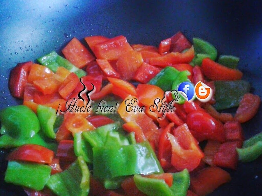 2.- Picamos los pimientos en cuartos, le quitamos la parte blanca y las semillas. En una cacerola ponemos unas cucharas de aceite y cocinamos los pimientos hasta que estén blando, añadimos una pizca de sal para que sude y suelten todo su sabor.