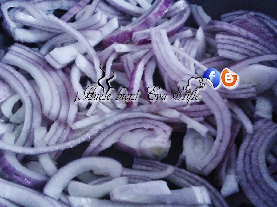 3.- Retiramos los pimientos y en la misma cacerola añadimos un poco de aceite y ponemos la cebolla cortada en tiras finas. Cocinamos hasta que estén transparente. Agregamos los ajos y lo dejamos al fuego unos minutos más.